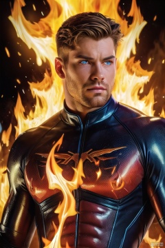 1man, auburn hair, fair skin, hero bodysuit, glowing eyes, beautiful amber eyes, (hyperdefined), natural bright colours, unusual-angle, artwork, flames, steam, complex lighting,(fine-details:1.2), absurdres, flat-colors, ultradetailed, swirling flames around man,, best quality, masterpiece, realistic, cinematic composition, (detailed background), depth of field, intricate details, 8k, detailed skin texture, detailed face, realistic eyes, male focus, photo of a man,
