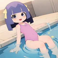 taosu, 1girl, solo, purple eyes, bangs, blunt bangs, purple hair, long hair, yellow ribbonm, smile, pink one-piece swimsuit,