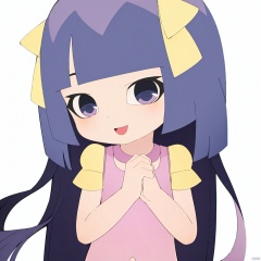 taosu, 1girl, solo, purple eyes, bangs, blunt bangs, purple hair, (long hair:1.3), yellow ribbonm, smile, pink one-piece swimsuit,