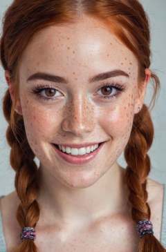 beautiful lady, (freckles), big smile, ruby eyes, pigtails hair, dark makeup, hyperdetailed photography, soft light, head and shoulders portrait, cover