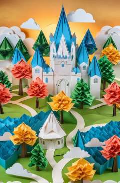 castle made of paper, highly detailed, paper clouds, paper trees, paper landscape, Modular Origami, Ultra-HD, Super-Resolution, origami, paper art, high quality image, masterpiece, hdr, 4k,