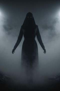 demonic, spooky, scary shadow figure woman emerging from the darkness, black and grey gradient, foggy, realistic, 8k, unreal engine, cinematic