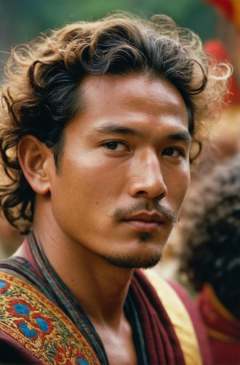 Hyperdetailed Photography, skin details, by Christian Schad, Nicolas Mignard, photograph,close up of a Tibetan (Male [Cherubim|Centaur]:1.2) , the Cherubim is Honorable and Regal, Visiting in a Ciudad Perdida, his hair is Beautiful, Sharp and in focus, Dark Wave Art, Lens Flare, Kodak Ektachrome E100, Depth of field 270mm, Electic Colors
