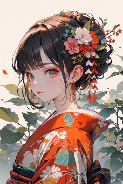 Ukiyo-e style, 1girl, solo, hair ornament, jewelry, flower, earrings, japanese clothes, kimono, hair flower, looking at viewer, bangs, upper body, red kimono, black hair, floral print, from side, simple background, red flower, leaf, white flower, closed mouth, looking to the side, makeup, print kimono, sash, short hair, brown eyes, obi, hair bun, blush, single hair bun, kanzashi