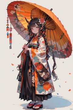 Ukiyo-e style, 1girl, solo, long hair, umbrella, hair ornament, braid, horns, japanese clothes, hair flower, twin braids, very long hair, black hair, full body, flower, holding, looking at viewer, kimono, standing, blush, floral print, wide sleeves, long sleeves, smile, holding umbrella, tabi, simple background, bangs, closed mouth, skirt, grey background, twintails, socks, single horn, sandals, oil-paper umbrella