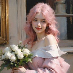 ART,(Oil Painting:1.2),(Impressionism),Best Quality,Masterpiece,High Resolution,Realistic,(Depth of Field | Amusement Park),1 Girl,Upper Body,(Bouquet | Blue Rose),(White Hair,Off Shoulder,Pleated Dress,Long Hair,Messy Hair,Beautiful Face,beauty face,smile,(pink hair:1.3),,