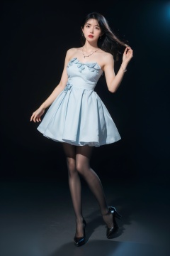 (((masterpiece))),(((best quality))),(realistic:1.1),photorealistic, ultra high res,8k, RAW photo,professionally color graded, professional photography,Highly detailed,finely detail,(beautiful face), (beautiful detailed eyes,shiny eyes),(shine light on face:1), (Volumetric lighting:1.2), (light on face:1),pale skin,shiny skin, ((full body)),1girl, black eyes, blue gemstone earrings, necklace, bracelet, bare shoulders, dress, flowing skirt, bow pantyhose, black pantyhose, high heels, (dynamic pose: 1.3), (flower: 1.3), (floating: 1.2), ray tracing, (head up: 1.3),<lora:xysz:0.7>