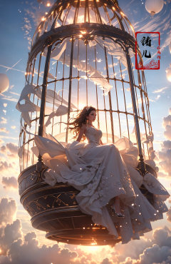 A beautiful woman with an angelic face on a hot air Huge birdcage, Huge birdcage drifts above above clouds, awed by the beauty below and, GoPro, motion blur, long exposure, full body, delicate features, high aesthetics and high art, immersed ina cinematic atmosphere, with an unreal portrait style, Paulina Washington, Chinese, realism, martial arts, Play light and shadow, Green light and shadow, Bauhaus photography, 28mm fantasy landscape, Camille Cloud, Selective focus, Panorama,(dramatic, gritty, intense:1.4),masterpiece, best quality, 32k uhd, insane details, intricate details, hyperdetailed, hyper quality, high detail, ultra detailed, Masterpiece,bridal veil,wedding dress,(Birdcage,Huge birdcage:1.4),<lora:绪儿-热气球stage:0.8>