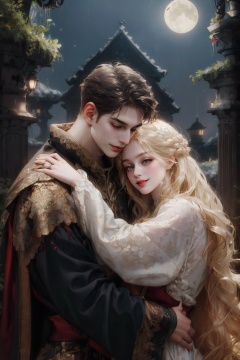 (absurdres, highres, ultra detailed), 2others, couple, 1man with 1woman, mature, Height difference, different hair color, happy, love, hug, upper body, long hair, black hair and blonde hair, fantasy, night