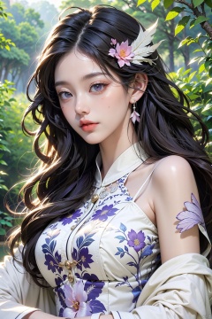 (((masterpiece))), (((best quality))), ((ultra-detailed)), (illustration), ((an extremely delicate and beautiful)),dynamic angle,floating, (beautiful detailed eyes), (detailed light) kafukalike,black eyewear on head,purple hair,purple eyes,feather, leaves, nature, (sunlight), river, (forest),(painting),(sketch),(bloom)