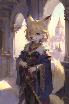 absurdres, highres, ultra detailed, masterpiece, sharp shading,wind,solo,perfect lighting,portrait, fox furry girl,(kid:1.5),indoors,blonde,high detail fur,fur paws ,fantasy,castle,singer outfit, hair over one eye, looking at viewer, <lora:GoodHands-beta2:0.7> <lora:Oilpainting:0.3>l <lora:bouguereau:0.3>, Furry Gir