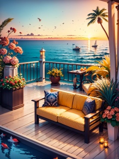 (No one), empty, summer seaside villas, outdoors, terraces, modern luxury leather sofas, exquisite printed fabric leather sofas, books, ornaments, palm trees, gardens, leisure chairs, sunshine, (sea), yachts, roses, colorful flowers, colorful sea water, vases, potted plants, fruit juice, romance, scenery, sunset, sunset, sunset, (no human beings),