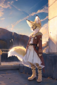 absurdres, highres, ultra detailed, masterpiece, sharp shading,wind,solo,perfect lighting,train fox cat girl,(kid:1.2),soumao,blonde,high detail fur,fur paws ,uniform,looking at viewer, <lora:GoodHands-beta2:0.7> <lora:bouguereau:0.3> <lora:servalcat:0.7>