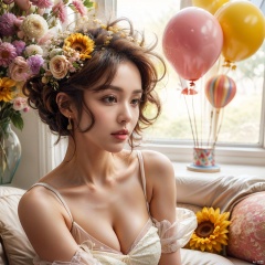 best quality, masterpiece, illustration, realistic, photo-realistic, amazing, finely detail, incredibly absurdres, huge filesize, ultra-detailed, highres, extremely detailed CG unity 8k wallpaper, nsfw, A close up portrait of a cute Korean-style woman with yellow slightly curly short hair and lively makeup in a cute pose, wearing a whimsical puffy white dress made of soft clouds like bubbles that accentuates her curves. The dress has lots of fluffy details resembling cute clouds. She is sitting casually on a pink balloon, soft lighting and shadows create a whimsical, chiaroscuro atmosphere. The style shows her cute personality,