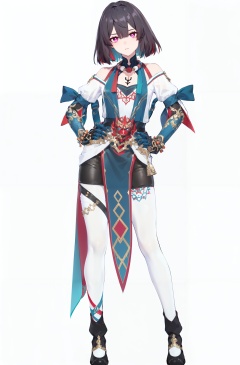 8k, best quality, masterpiece, (ultra-detailed:1.1), (high detailed skin), (full body:1.3), white background, standing, looking at viewer, (solo:1.4), hand on hip, <lora:xueyi-yz-v100:0.8:lbw=OUTALL>, xueyi, 1girl, short hair, black hair, multicolored hair, jewelry, colored inner hair, thighhighs, multicolored eyes, red hair, white thighhighs, (white background, simple background:1.6), (beautiful_face), ((intricate_detail)), clear face, ((finely_detailed)), fine_fabric_emphasis, ((glossy)), full_shot