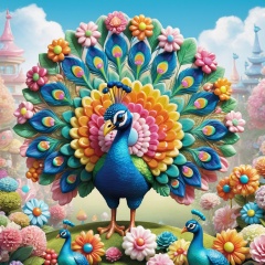 GummiRay,Imagine a charming,stylized scene where a whimsical peacock,crafted from soft,colorful gummy candies,displays its adorable,oversized plumage. The peacock has a delightful,cartoonish appearance with exaggerated,cute features. Its feathers are a playful patchwork of bright gummy shapes,with larger-than-life,sparkling eyespots made from iridescent gummy rings. The body is a round,cuddly shape,boasting a vibrant blue and green gummy texture that invites a sense of joy and wonder. This miniature peacock sits in a fantasy garden filled with candy flowers and marshmallow bushes,beneath a sky of cotton candy clouds. The artwork should be rendered in a cheerful,digital art style,focusing on bold,exaggerated details that emphasize the peacock's endearing qualities and the soft,sugary appeal of the gummy world it inhabits,(((poakl flower style))),<lora:poaklflowerstyle-000010:0.6>,