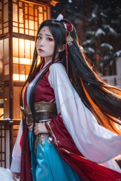 A girl, in the midst of heavy snowfall, wearing a red Hanfu, adorned with jewelry and accessories, possessing ultra-long hair that flows freely, donning a waistcoat, looking directly at the camera, her long hair billowing in the wind.