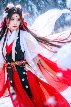 A girl, in the midst of heavy snowfall, wearing a red Hanfu, adorned with jewelry and accessories, possessing ultra-long hair that flows freely, donning a waistcoat, looking directly at the camera, her long hair billowing in the wind.