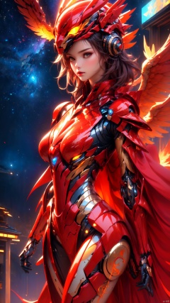 ((Charming Beauty, Mechanical Body), Cyberpunk Mech, (Phoenix Helmet), (Glass Sealed Mask), Oriental Beauty, Starry Sky Background, Detail Sculpture, Master, Full body Mech Reflective, Octane Rendering, Metallic Gloss, Fire Red Mech Armor, (Phoenix Embroidered Cloak), Fluorescent Liquid Flow, Metal Transparent Infusion Tube, (Masterpiece), Illustrations, Best Quality, Very Detailed CG, 8k Wallpaper, Extremely Exquisite and Beautiful, Game CG, (Full body Photo), Streamlined Good Figure, Slender Thighs, Cyber Shin, Sur Reality Realistic, (realistic style), solo, ultra detail, (telephoto lens), (ultra fine detail), (CG rendering), xihua
