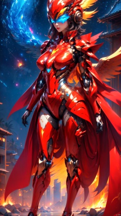 ((Charming Beauty, Mechanical Body), Cyberpunk Mech, (Phoenix Helmet), (Glass Sealed Mask), Oriental Beauty, Starry Sky Background, Detail Sculpture, Master, Full body Mech Reflective, Octane Rendering, Metallic Gloss, Fire Red Mech Armor, (Phoenix Embroidered Cloak), Fluorescent Liquid Flow, Metal Transparent Infusion Tube, (Masterpiece), Illustrations, Best Quality, Very Detailed CG, 8k Wallpaper, Extremely Exquisite and Beautiful, Game CG, (Full body Photo), Streamlined Good Figure, Slender Thighs, Cyber Shin, Sur Reality Realistic, (realistic style), solo, ultra detail, (telephoto lens), (ultra fine detail), (CG rendering), xihua