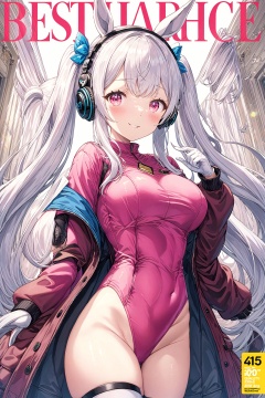 (masterpiece:1.4, best quality:1.4), illustrations, (solo:1.2), (original), (very detailed wallpaper), photographic reality, (ultra detailed:1.4), (super complex details), ((Magazine cover-style:1.4)1girl, animal ears, bangs, blush, bodysuit, breasts, closed mouth, fake animal ears, gloves, headphones, headset, horse ears, impossible clothes, jacket, large breasts, long hair, long sleeves, looking at viewer, pink bodysuit, pink eyes, simple background, skin tight, smile, solo, twintails, upper body, very long hair, white background, white gloves, white hair,alice \(nikke\),(masterpiece:1.4),(best quality:1.4),(shiny skin),realistic