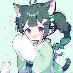 best quality,(masterpiece:1.3),1girl, animal ears, solo, drooling, tail, cat ears, purple eyes, animal ear fluff, cat tail, black hair, green background, bangs, long sleeves, japanese clothes, wide sleeves, +_+, open mouth, blush, hair bun, kimono, green kimono, chibi, sparkle, upper body, simple background, mouth drool, sleeves past wrists, saliva, hair ornament, cat girl, spoken object, single hair bun, kemonomimi mode, tail raised, hands in opposite sleeves, long hair, sleeves past fingers, sparkling eyes, low twintails, smile, :d, twintails, own hands together, hands up, braid