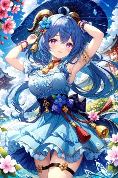 The subject is a single female character with long hair, noticeable breasts, and an engaging gaze towards the viewer. She has a pleasant smile with her mouth slightly open. Her hairstyle includes bangs and sidelocks, complementing her elegant dress adorned with jewelry. She possesses medium-sized breasts and distinctive blue hair that beautifully contrasts with her purple eyes. A flower accessory adorns her head along with an ahoge. The scene takes place outdoors under a sky filled with clouds, where she gracefully raises her arms showcasing delicate bracelets against the backdrop of a serene blue sky. A bell necklace hangs around her neck while she stands in shallow water surrounded by frills and horns. Additionally, she wears an alternate costume featuring tassels and holds a blue flower called "Vision" from the game Genshin Impact, representing the character named Ganyu.