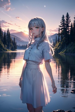 masterpiece, best quality, cinematic lighting, extremely detailed CG unity 8k wallpaper,.1girl, Silver long hair, flowing long hair, green eyes, pink clothes, white skirt, side gaze towards the camera, looking towards the camera, by the lake, in the wilderness, in the surrounding forests, full moon in the sky, moonlight reflected in the lake, lake reflections, distant mountains, birds, clouds.Evening, sunny, summer.Half-length photo,
