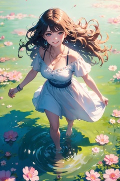 (full body:1.1),masterpiece,bestquality,8k,officialart,cinematiclight,ultrahighres,1girl,(wavy hair:1.1),drop earrings,necklace,shiny skin,look at view, ((ink)),(water color),bloom effect,detailed beautiful grassland with petal,flower,butterfly,necklace,smile,petal,(((surrounded by heavy floating petal flow)))