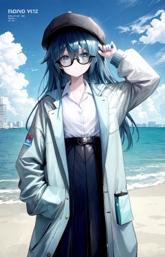 1girl, long hair, brown coat, fake cover, round eyewear, blue eyes, blue hair, shirt, black headwear, solo, looking at viewer, hat, coat, skirt, outdoors, glasses, very long hair, black skirt, cover, long sleeves, tinted eyewear, nail polish, closed mouth, open coat, white shirt, belt, blue nails, character name, open clothes, bangs, hair between eyes, alternate costume, sunglasses, sleeves past wrists, building