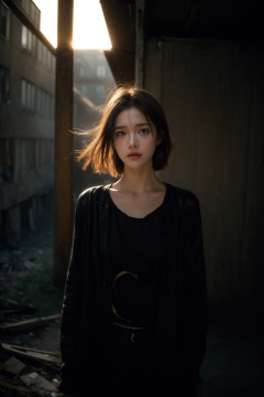 portrait of 1girl by Bill Henson,depressed,tears,streaming tears,ruins,shadows,dramatic lighting,sunset,cowboy shot,contemporary,dark,expressionism,dystopia,industrial,<lora:add_detail:1>,<lora:MengX girl_Mix_V40:0.8>,