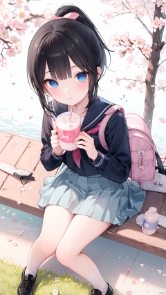 , black hair, 1girl, umbrella, school uniform, blue eyes, solo, ponytail, sitting, bottle, cat, bag, skirt, blush, cherry blossoms, looking at viewer, shoes, serafuku, ribbon, drinking, depth of field, petals, from above, school bag