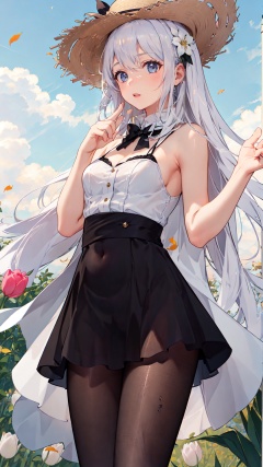 tutututu,black pantyhose,finely detail, Depth of field,(((masterpiece))),((extremely detailed CG unity 8k wallpaper)),best quality, high resolution illustration,Amazing,highres,intricate detail,(best illumination, best shadow, an extremely delicate and beautiful),1girl, hat,solo,white hair, long_hair,  bare_shoulders, sleeveless,hat_flower,straw_hat,white sundress,straw hat, looking_at_viewer, Lilac eyes,Lovely face,open one's mouth,middle finger,show the middle finger,(((Tyndall effect))),dappled sunlight,cloud, flower, autumn_leaves, outdoors, autumn, blue_sky, leaf, sunset, cloudy_sky, burning, owl, maple_leaf,tulips,<lora:merged_0024:0.7>,