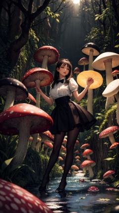tutututu,black pantyhose,high heels,***** Alice in wonderland standing in stream,large mushrooms in background,highly detailed,Beautiful lighting,photoreal,4k,depth of field,night scene,light from godrays shining on ground,<lora:merged_0024:0.75>,
