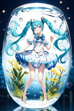 -1girl, long hair, solo, hatsune miku, green hair, twintails, very long hair, in container, flower, green eyes, ribbon, fish, barefoot, dress, polka dot<lora:Crystal ball_20240112152706:0.8>