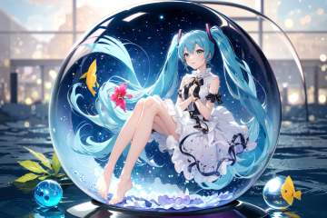 -1girl, long hair, solo, hatsune miku, green hair, twintails, very long hair, in container, flower, green eyes, ribbon, fish, barefoot, dress, polka dot<lora:Crystal ball_20240112152706:0.8>,Crystal ball,