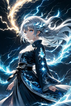 (masterpiece, top quality, best quality, official art, beautiful and aesthetic:1.2),(1girl:1.2),cute,extreme detailed,(abstract:1.4, fractal art:1.3),(silver_hair:1.1),fate \(series\),colorful,highest detailed,fire,ice,lightning,(splash_art:1.2),jewelry:1.4,hanfu,scenery,ink,composed of elements of thunder,thunder,electricity,<lora:雷元素-特效[SDXL白棱Lora]_v1.0:0.8>,