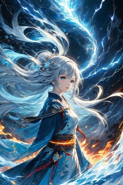 (masterpiece, top quality, best quality, official art, beautiful and aesthetic:1.2),(1girl:1.2),cute,extreme detailed,(abstract:1.4, fractal art:1.3),(silver_hair:1.1),fate \(series\),colorful,highest detailed,fire,ice,lightning,(splash_art:1.2),jewelry:1.4,hanfu,scenery,ink,composed of elements of thunder,thunder,electricity,fire element,composed of fire elements,<lora:火元素-特效[SDXL白棱Lora]_v1.0:0.7>,
