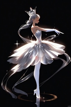1girl,solo,long hair,simple background,gloves,dress,bare shoulders,very long hair,standing,full body,closed eyes,grey hair,pantyhose,sparkle,strapless,profile,standing on one leg,crown,black background,strapless dress,white pantyhose,tiptoes,ballerina,ballet slippers,ballet,tutu