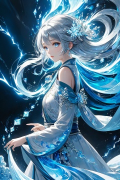 (masterpiece, top quality, best quality, official art, beautiful and aesthetic:1.2),(1girl:1.2),cute,extreme detailed,(abstract:1.4, fractal art:1.3),(silver_hair:1.1),fate \(series\),colorful,highest detailed,fire,ice,lightning,(splash_art:1.2),jewelry:1.4,hanfu,scenery,ink,