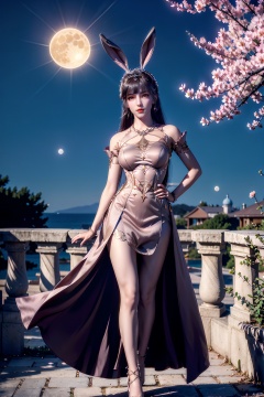 (8k, RAW photo, masterpiece:1.2),solo,(super realistic, photo-realistic:1.3),ultra-detailed,extremely detailed cg 8k wallpaper,hatching (texture),skin gloss,light persona,(crystalstexture skin:1.2),(extremely delicate and beautiful),(full body:1.4),(cherry blossoms, cloud, full moon, looking at viewer, moon, moonlight, night, night sky, outdoors, petals, blue moon, rose petals, sky, star sky, starry sky, sun),1girl,very long hair,red dress,(red eyes),long dress,((rabbit ears)),( pov:1.2),makeup,jewelry,earrings,necklace,(eyelashes:1.2),seductive smile,makeup,Tall figure,slender long legs,black_pantyhose,red footwear,high heels, thighhighs, standing,lumbar girdle,(cowboy shot),looking_at_viewer, mds22, xw