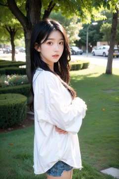 1girl, long hair, beautiful, small fresh, depth of field, Outdoor, Flower, Grass, Tree,
