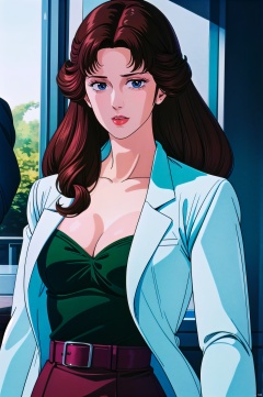 Reika, 1girl, brown hair, breasts, cleavage, retro artstyle, blue eyes, solo, long hair, belt, labcoat, medium breasts, 1980s \(style\),nice hands, perfect balance,  looking at viewer,  closed mouth,  (Light_Smile:0.3),  official art,  extremely detailed CG unity 8k wallpaper,  perfect lighting,  Colorful,  Bright_Front_face_Lighting,  White skin,  (masterpiece:1),  (best_quality:1),  ultra high res,  4K,  ultra-detailed,  photography,  8K,  HDR,  highres,  absurdres:1.2,  Kodak portra 400,  film grain,  blurry background,  bokeh:1.2,  lens flare,  (vibrant_color:1.2),  professional photograph,  (narrow_waist), , dark studio, , Reika