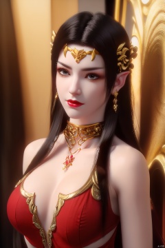 (8k, RAW photo, best quality, masterpiece:1.2), ,ultra-detailed, ,(extremely delicate and beautiful),hair ornament1girl, solo, jewelry, pointy ears, long hair, clothing cutout, earrings, , dress, breasts, arms up, red dress, brown hair, looking at viewer,, navel, black hair,1girl, solo, pointy ears, jewelry, long hair, earrings, breasts, clothing cutout,, navel, brown hair, looking at viewer, black hair, upper body,Black silk bra,Black silk , 1girl,portrait,,solo,earrings,jewelry,,huge breast,,collarbone,,upper body,red lips,(white skin),,((( jewelry,,kneeling,skin glory,hair ornament,Black silk ))),arm behind back,looking at viewer, , mds
