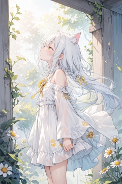 yellow theme,the setting sun,(((Chamomile))),Chamomile,cornflower,vines,forest,ruins,lens flare,hdr,Tyndall effect,damp,wet,1girl,bare shoulders,broken glass,broken wall,white hair,white dress,closed mouth,constel lation,flat color,braid,blinking,white robe,float,closed mouth,constel lation,flat color,looking up,standing,medium hair,standing,solo,((catgirl)),