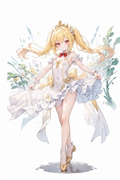(best quality), ((masterpiece)), (highres),standing,original, extremely detailed wallpaper, (an extremely delicate and beautiful),(petite:1.2),yellow hair,red eyes,twin_tails,hair flower,fipped hair,floating hair,red bowtie, white dance dress,simple drawing,detailed background,elegant,smiling,dancing pose,dancing,ballet,tiara the result is a culturally rich portrayal that celebrates beauty, grace, and the uplifting emotions brought forth by the art of ballet,leg up:0.5, yellow tone color,full body,
