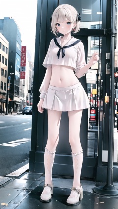 1girl,((full body)), (long legs), earrings,standing,high heels,,city,street, hair stick,vivid,colorful, bare belly,minisailor, bowknot socks,white,( figma:0.8)