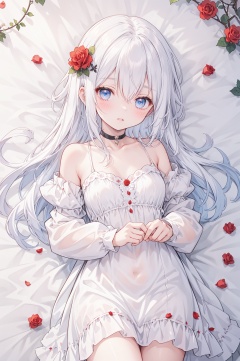 1girl, solo, red flower, flower, blue eyes, long hair, holding flower, holding, rose, dress, petals, hair ornament, red rose, lying, long sleeves, white hair, on back, white dress, looking at viewer, choker, parted lips, bare shoulders, blush, bangs, off shoulder, black choker, hair flower, off-shoulder dress, very long hair, collarbone, puffy long sleeves, puffy sleeves, rose petals, hair between eyes,eyesseye, dofas, crystal