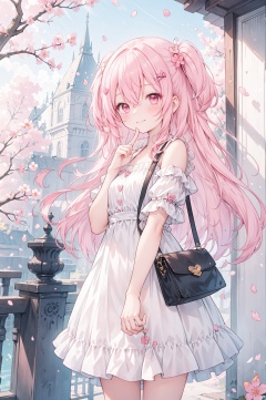 1girl, solo, pink hair, long hair, outdoors, hair ornament, very long hair, bangs, smile, heart hair ornament, dress, looking at viewer, short sleeves, finger to mouth, day, cherry blossoms, white dress, heart, closed mouth, blush, hair between eyes, hand up, red eyes, hairclip, bag, building, tree, petals, standing, flower, index finger raised, pink flower, shoulder bag, sky, two side up, pink eyes