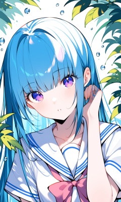 1girl, solo, looking at viewer, water drop, leaf, bangs, blush, purple eyes, hand up, upper body, parted lips, long hair, branch, shirt, ribbon, blue hair, short sleeves, collarbone, school uniform, white sailor collar, plant, pink ribbon